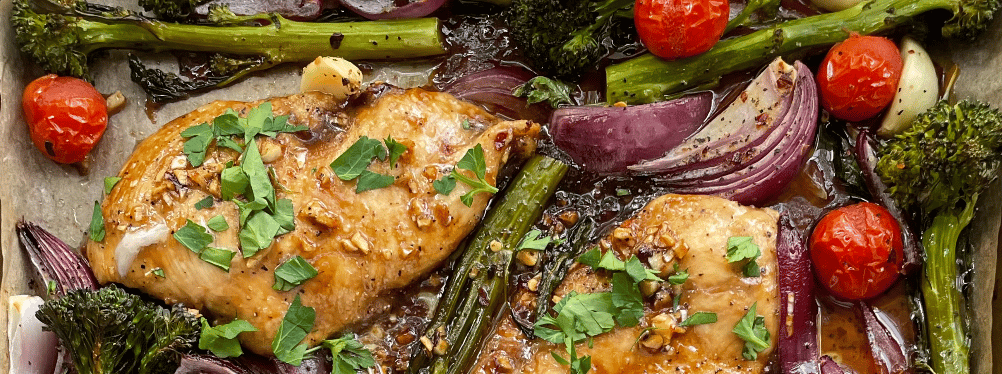 Made with balsamic glaze, garlic, and red pepper flakes, this balsamic chicken gives you a great combination of sweet and spicy. It's paired with roasted broccolini, red onion, garlic cloves, and bursting cherry tomatoes. It's juicy, flavor-packed, and can be made in under an hour!