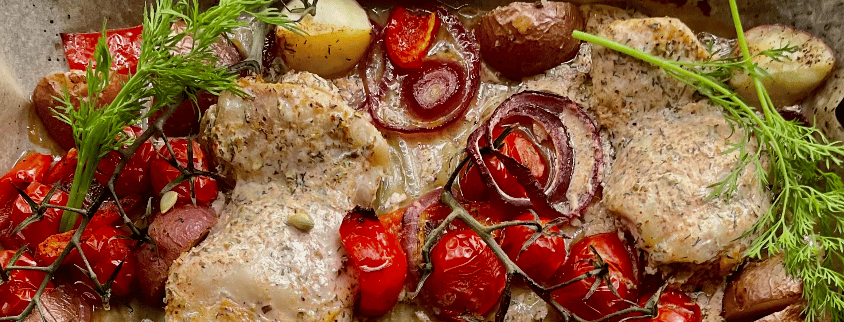 I have never met a chicken thigh more tender than this recipe! Marinated in a homemade Mediterranean spice blend, Greek yogurt, and lemon juice, they are quite literally the most moist chicken thigh I have ever had. Served alongside roasted red potatoes, red onion rings, and on-the-vine cherry tomatoes...I promise you'll love it okay just trust me!