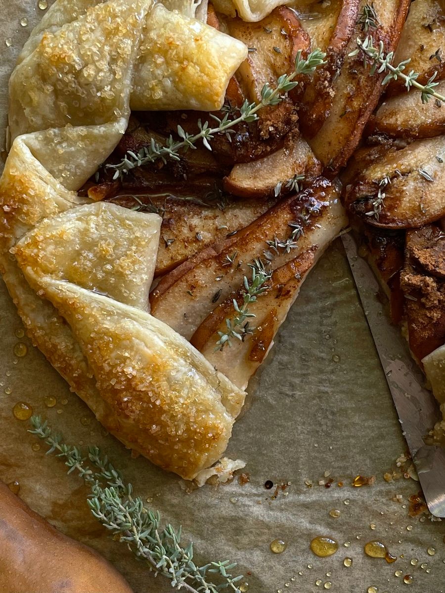 - Honey Goat Cheese Pear Galette with Cinnamon and Fresh Thyme