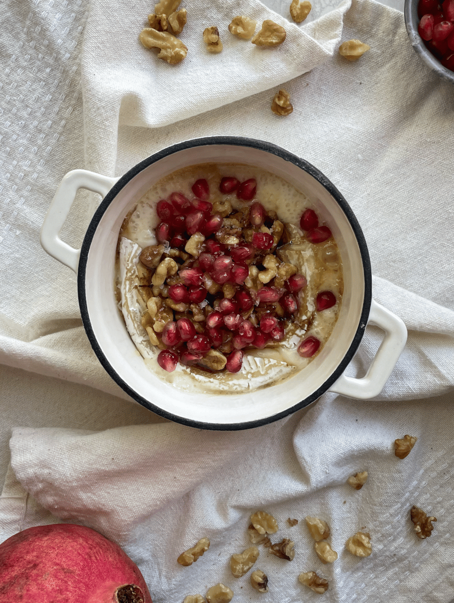 Sprinkle pomegranate arils and Maldon sea salt on top, then serve immediately with crackers!
