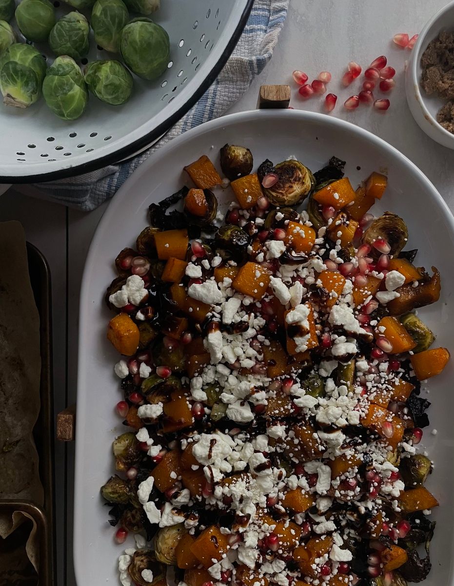 - Roasted Butternut Squash and Brussel Sprout Salad with Pomegranate and Goat Cheese