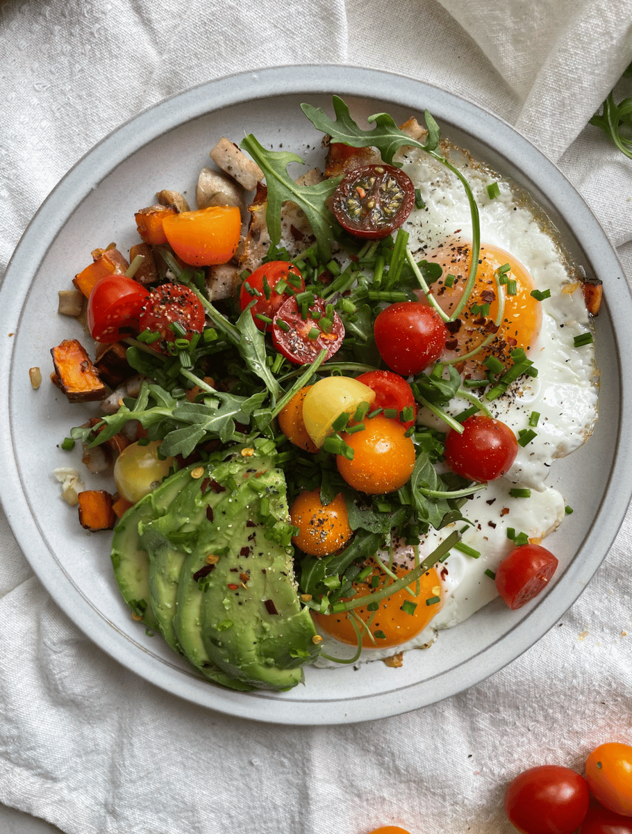 Layer the sweet potato mixture on the bottom of a plate, then top it with the eggs, arugula, tomatoes, and avocado. Sprinkle red pepper flakes and chives on top and serve.